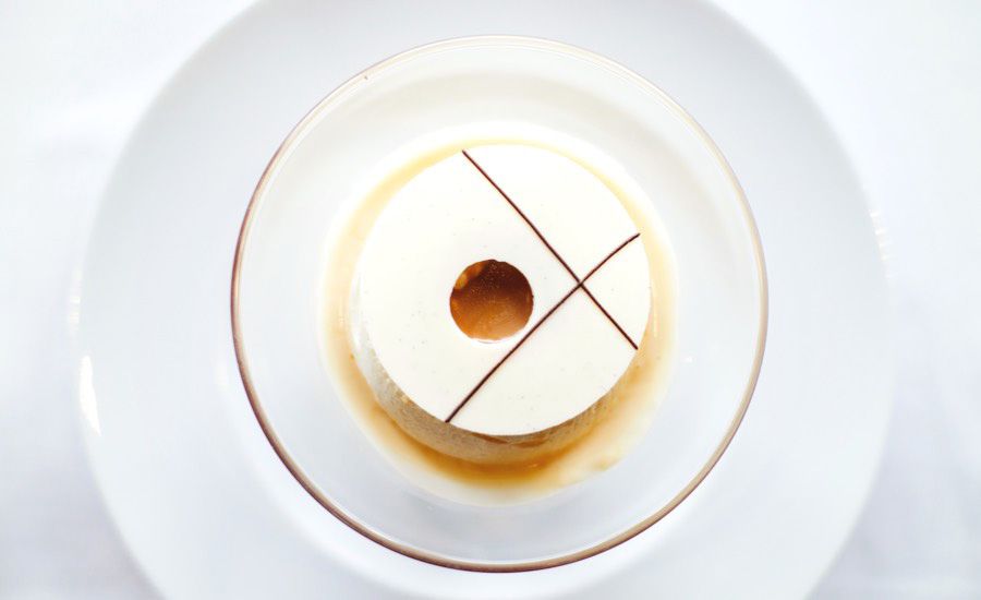Basil-citrus panna cotta on strawberry mirror
